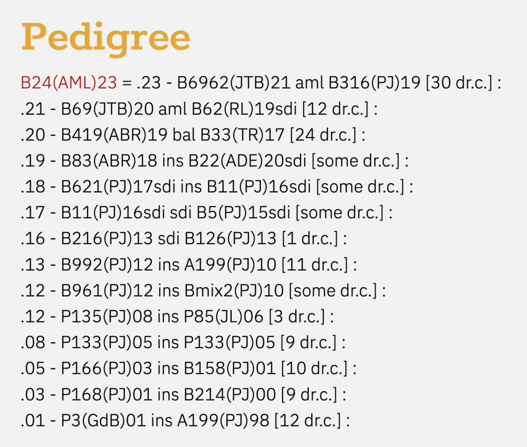 Stuifmeel wordt netjes in beperkte hoeveelheden buiten het broednest opgeslagen. De honing gaat vlot omhoog. Het volk van B24 zelf heeft nog nooit een zwermcel aangezet. Niet in het testjaar in een Dadantkast tussen de productievolken en ook niet het jaar daarna in een mini+. Bij de F1 dochters komt er soms wel wat zwermdrift voor maar een kleine ingreep is altijd voldoende. De koninginnen kunnen probleemloos het hele jaar op de volken blijven. - Zachtaardigheid en raatzit zijn voorbeeldig.